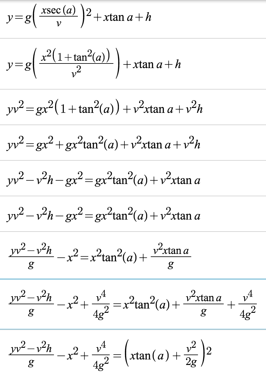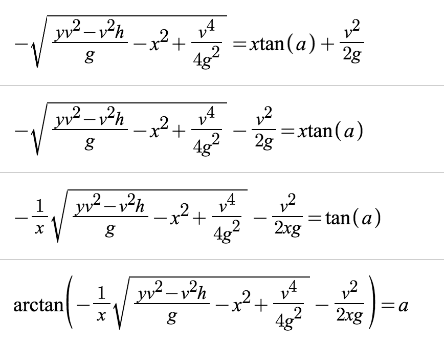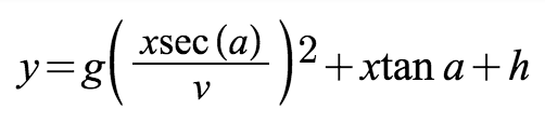 Where x&y are the target coordinates a is the angle, v is the velocity, and h is the hight of the launch. Our final goal is to create an equation where you can input any target, any velocity, and any height, and find the angle necessary to hit the target.